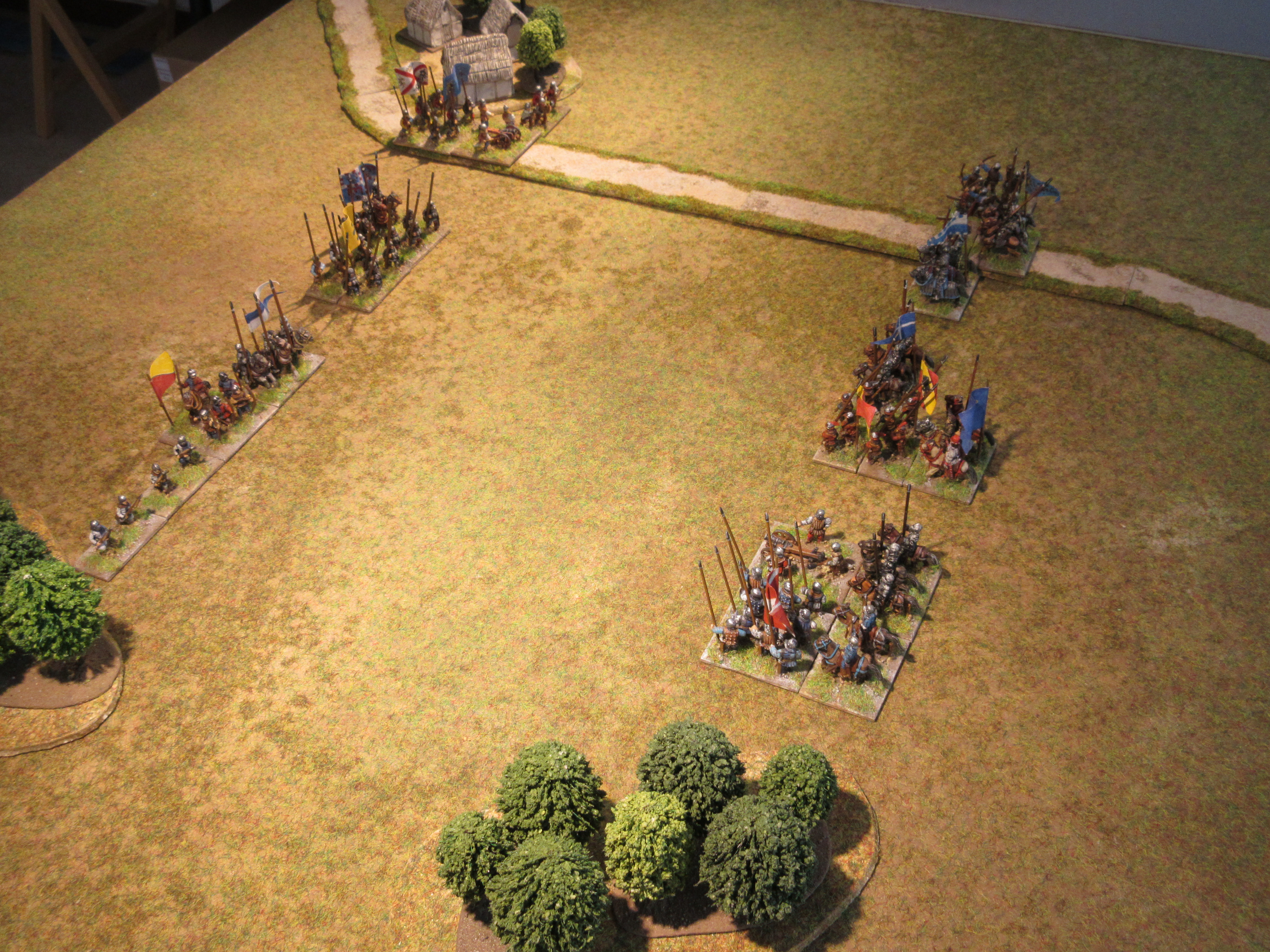 The late medieval period is our current interest and this past week we tested an alternative method to deploy our armies. The three columns organised for the collision course variant are now labelled the vanward, mainward and rearward. The three parts would no longer march on the table, but are placed within the deployment zone with players alternating the placement of their groups. The defender placed the vanward first, followed by the attacker placing his; the sequence continued until all groups and mobile baggage were on the board.